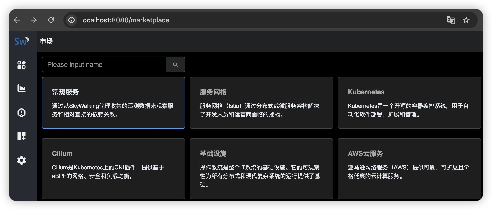 先启动好后端服务,包括 Skywalking 和 Easysearch。启动完成后能通过 Web UI 访问 Skywalking。