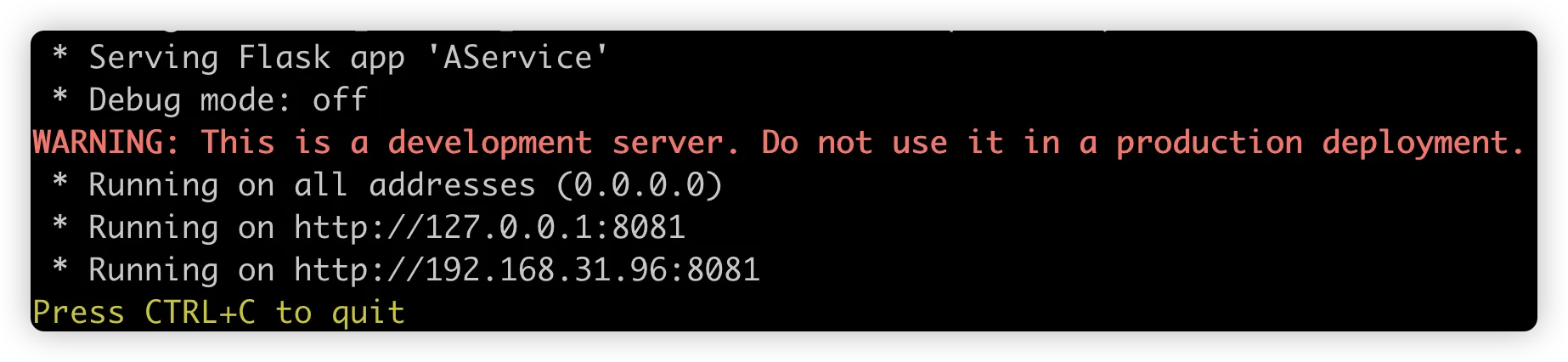 我们编写一个简单的 Flask 服务程序,只要访问 localhost:8081/a 就会返回 “Hello, I’m Service A!” 信息。