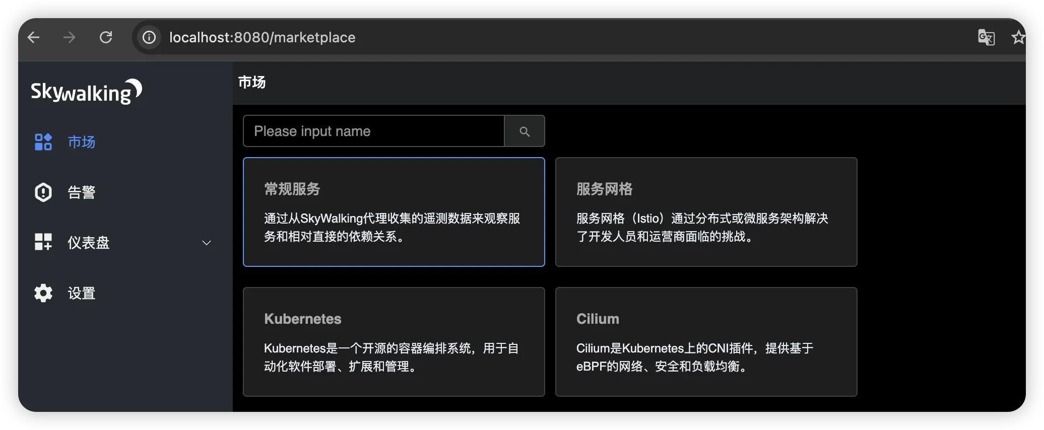 确保 Easysearch 启动完毕后,再启动 Skywalking。正常启动完成后,可访问 Skywalking 服务页面,默认端口 8080。