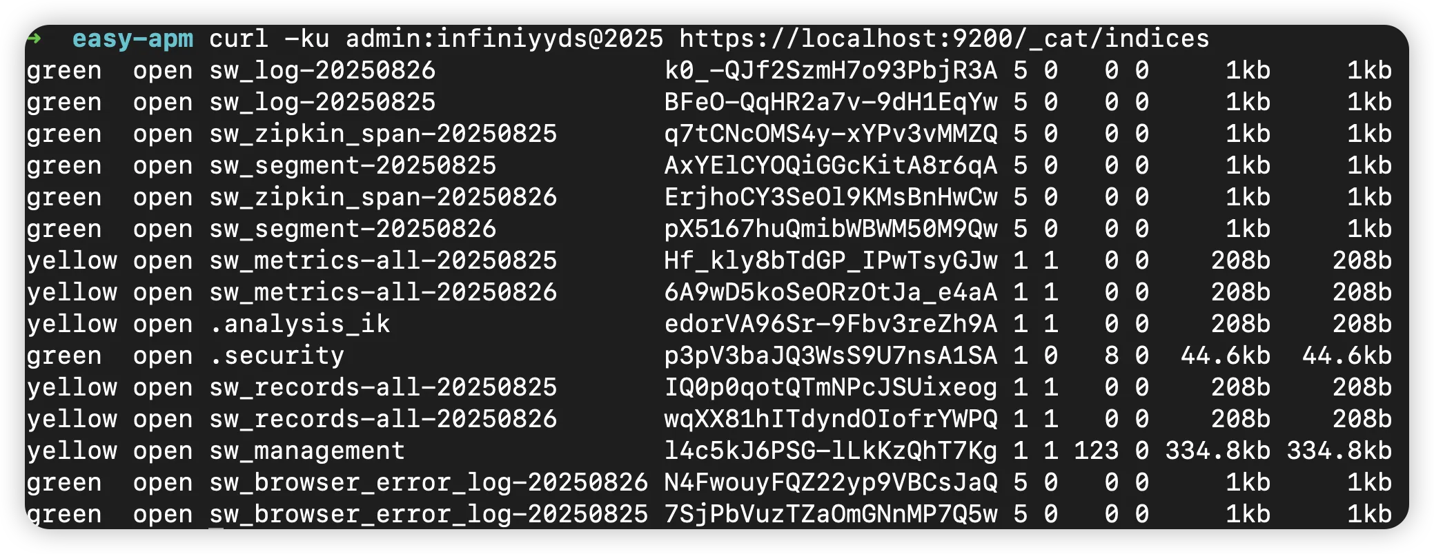 正常连接后,Skywalking 会在 Easysearch 中创建很多 sw 开头的索引。
