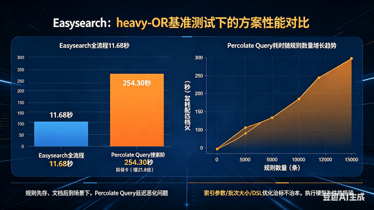 同样 15,000 条重规则,Percolate Query 比 Easysearch 慢 21.8 倍——Heavy-OR 场景实测