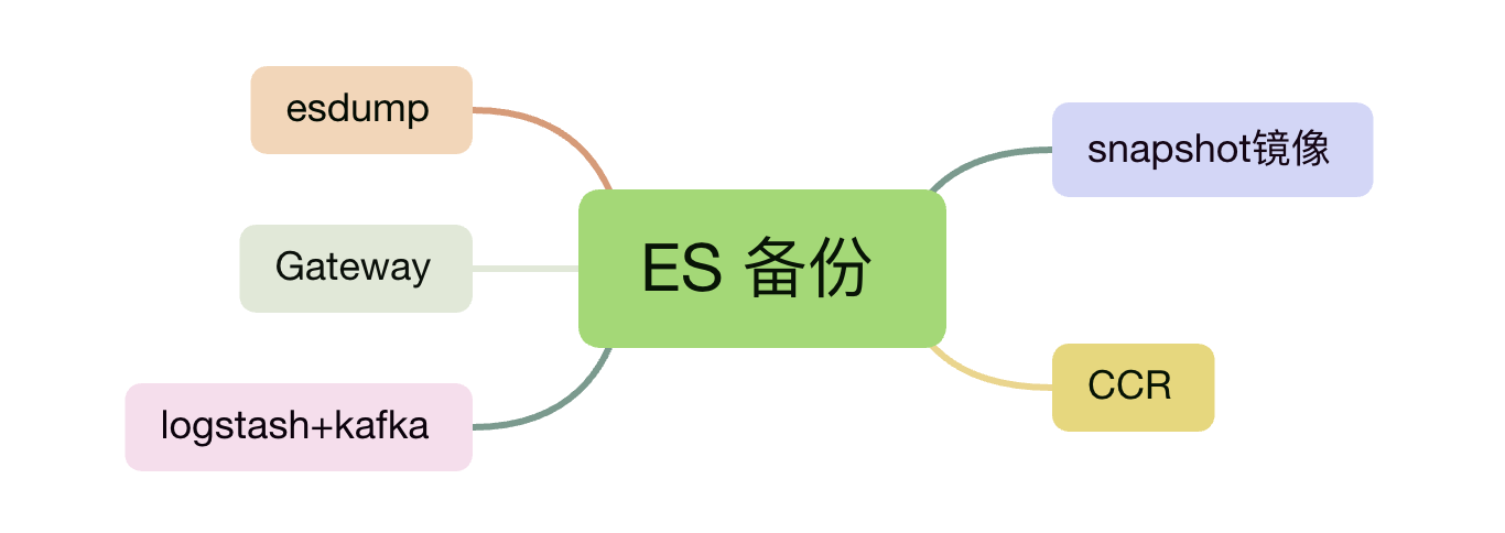 社区里,ES 的备份方案有很多,除了 ES 自带的 snapshot 和 CCR 外,还有社区里很多开源项目,如 esdump、gateway 等等,当然你也可以用 logstash+kafka 之类组件通过数据同步的自建方案(自建方案本文不进行阐述)实现数据备份的效果。