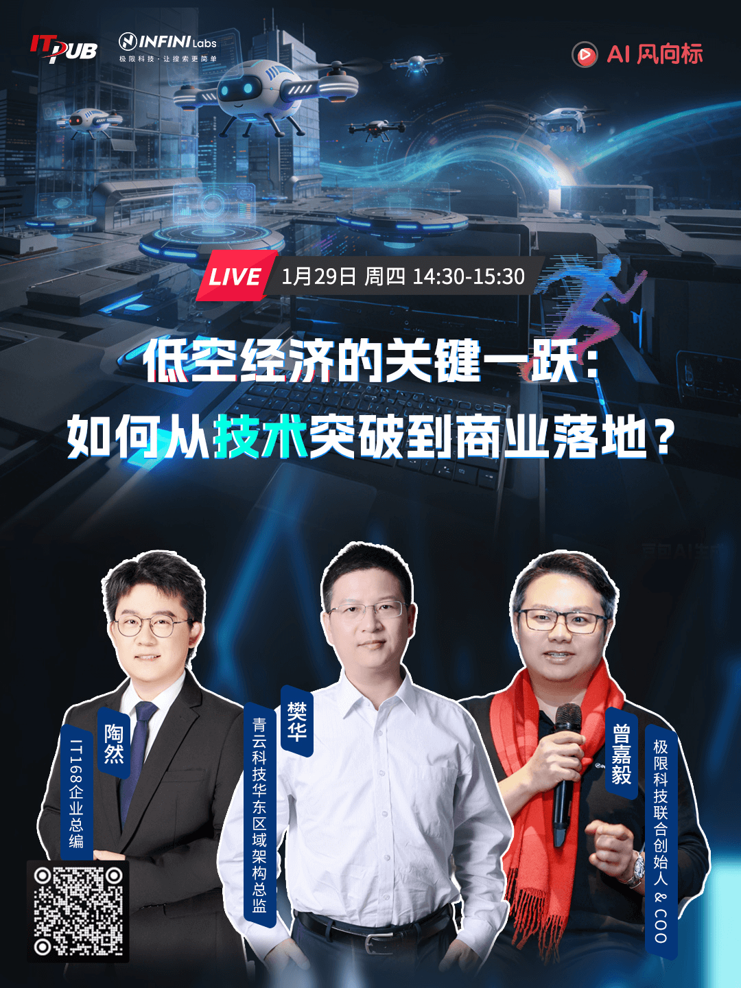 本次研讨会由 IT168 企业总编陶然主持,特邀 极限科技联合创始人曾嘉毅 与青云科技华东区域架构总监樊华作为主讲嘉宾,分别从云计算架构与数据智能平台的角度,分享了对于低空经济系统构建中关键技术支撑与落地实践的深刻洞察。