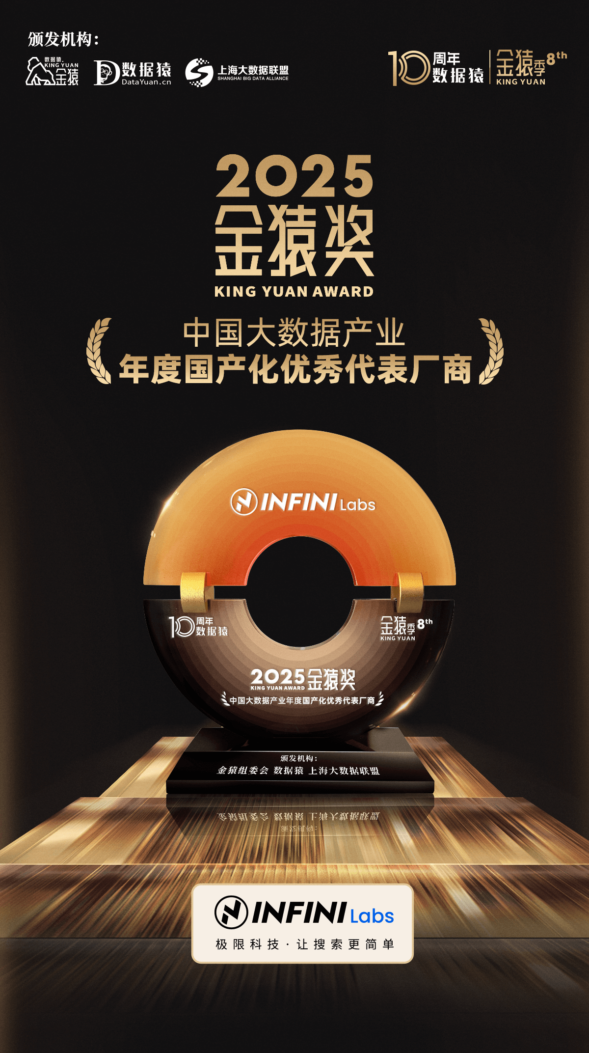 本届论坛由金猿组委会、数据猿、上海市数商协会及上海大数据联盟联合主办,以“数据有猿·智见十年”为主题,吸引了近千家企业参与申报。经过严格的初审、公审与终审交叉验证机制,极限科技最终从众多竞争者中脱颖而出,荣登榜单。